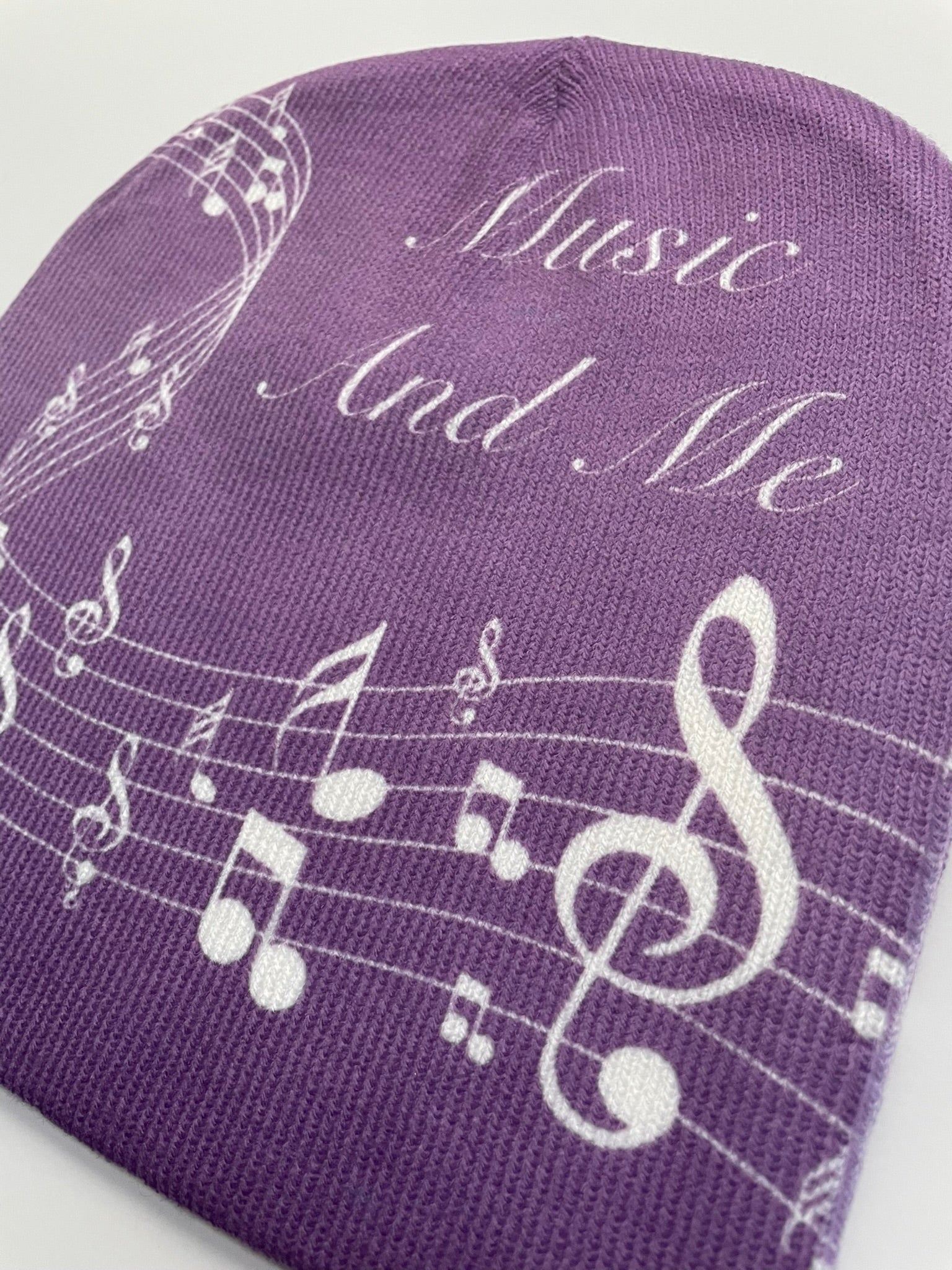 SUPER SOFT BEANIE, WITH SABOTAGE MUSIC DESIGN FRONT AND BACK, 2 DIFFERENT DESIGN FRONT AND BACK. PURPLE, WHITE AND GREY COLOR DESIGN. DESIGNED IN ITALY AND MADE WITH 100% SOFT ACRYLIC.